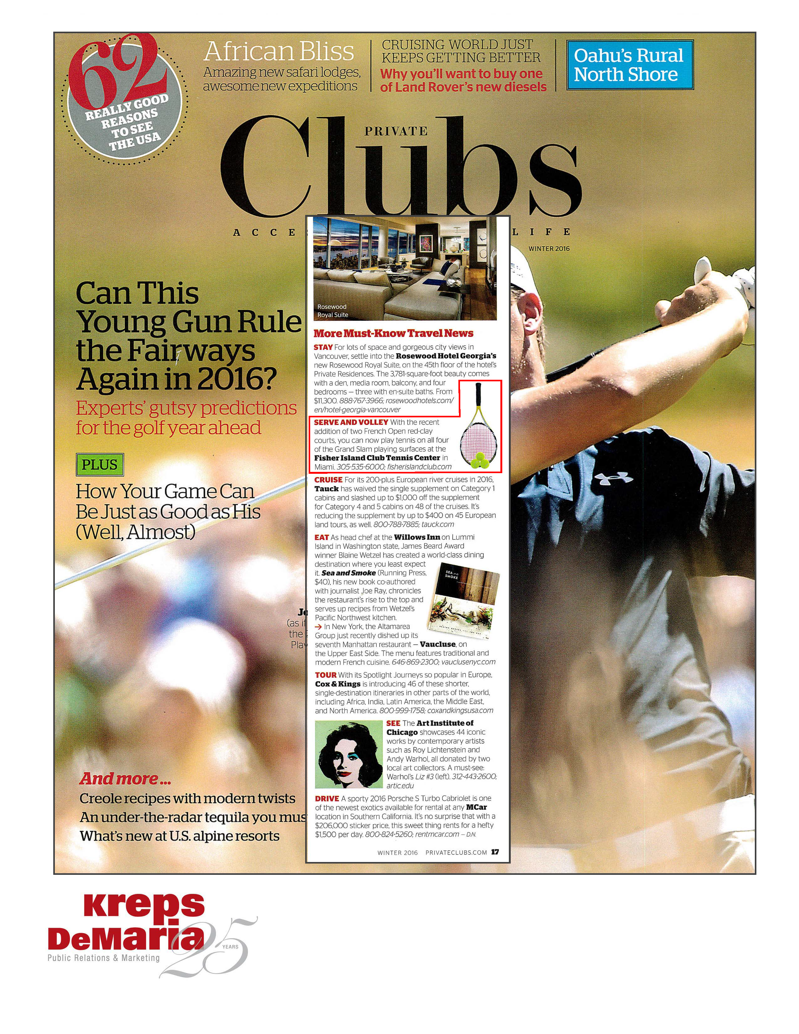 Fisher Island Club’s two new French Open red clay tennis courts were featured in the Winter issue of Private Clubs magazine.